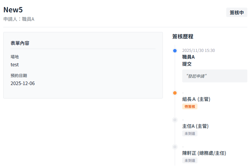 當申請者或行政人員查看「簽核中」的表單時,可看到目前簽核的狀態,是卡在哪一關。