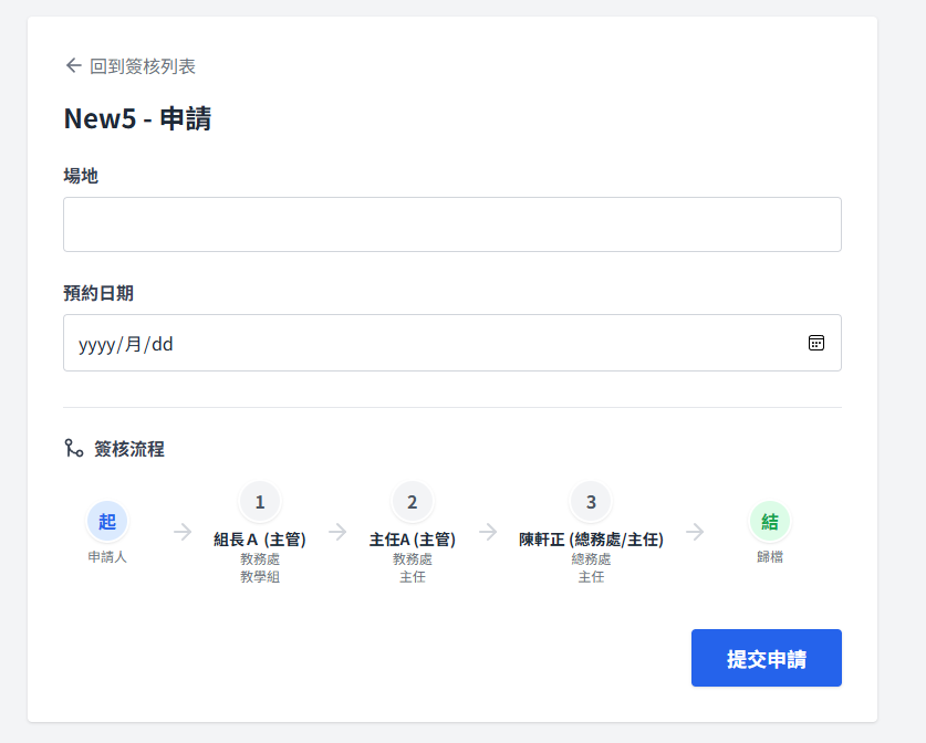 按下表單右方的「填寫」按鈕之後,會出現表單填寫的畫面,類似Google表單,不過下方會出現簽核流程。如下圖是模擬教學組的幹事提供申請後,因為第一個簽核者選擇「單位主管」,所以系統會自動帶出組長及主任,再來才是到下一個處室。
