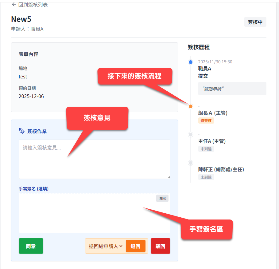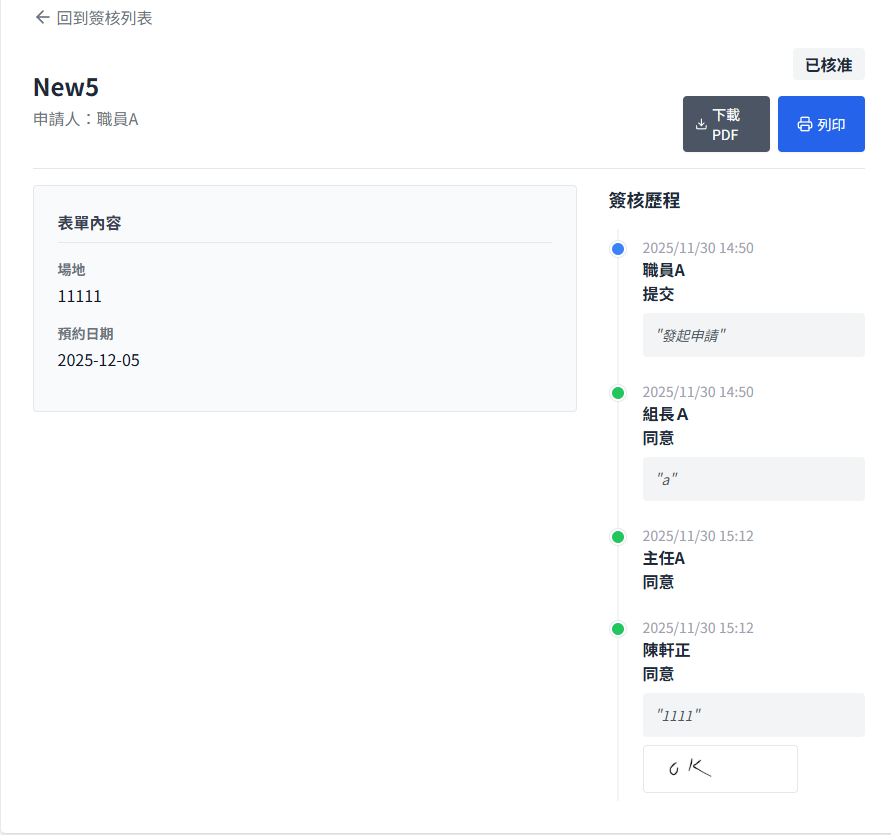 - 簽核歷程:可看到每個簽核者簽核的時間及意見。