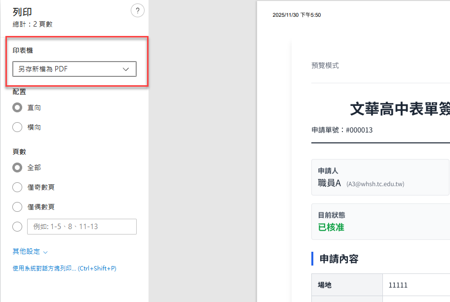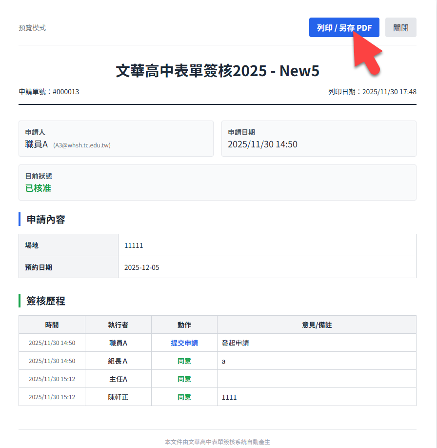 如果是「已核准」的表單,右上角會出現「下載PDF」及「列印」兩個按鈕。