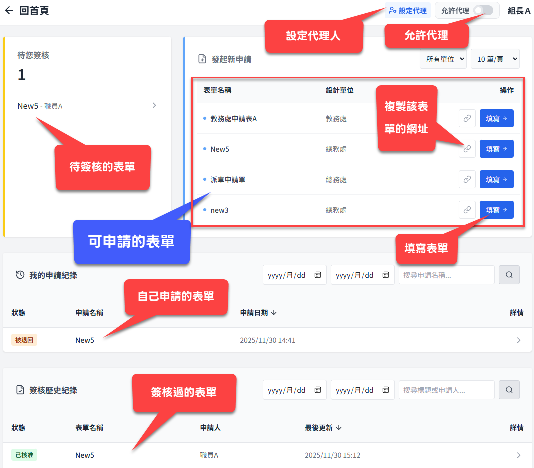 - 「待您簽核」會列出目前要簽核的表單,一般使用者則不會顯示。如果是代理人設為你並開啟「允許代理」的表單,表單名稱前方會出現一個「代」字,表示為代理簽核。