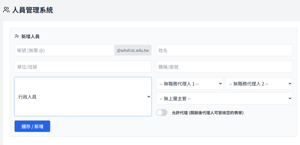 行政人員可設定兩名職務代理人(使用者自己也可設定),並可設定上層的主管(簽核用,單位主管可免設),並可勾選是否要允許代理(使用者自己也可設定)。