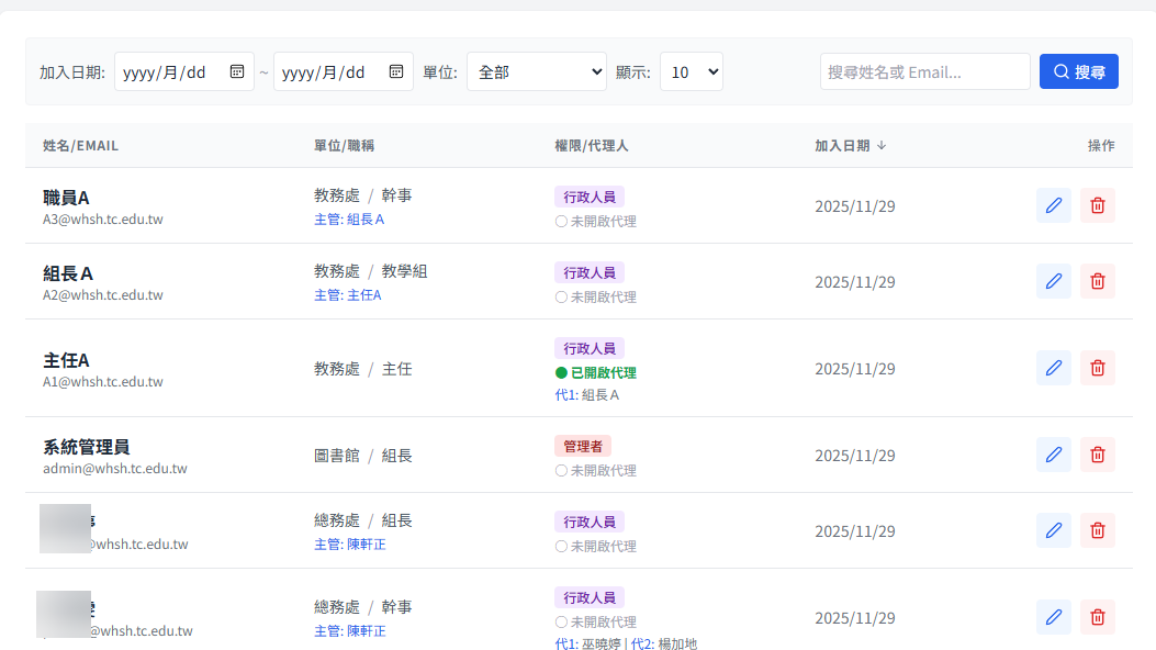 可看到人員的姓名/Email、單位/職稱(及其主管)、權限/代理人(及是否開啟代理)及加入日期。